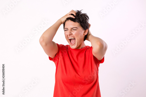 Human emotions and feelings.People, youth and happiness.charming young woman model smiling widely with her white straight teeth while holding her hands to her face posing in the Studio