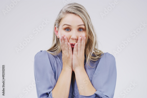 I actually dont know what to say. Studio portrait of an attractive young woman looking shocked against a grey background.