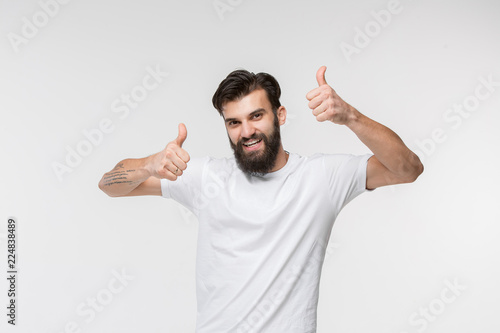 I am ok. Happy businessman, sign ok, smiling, isolated on white studio background. Beautiful male half-length portrait. Emotional man. Human emotions, facial expression concept. Front