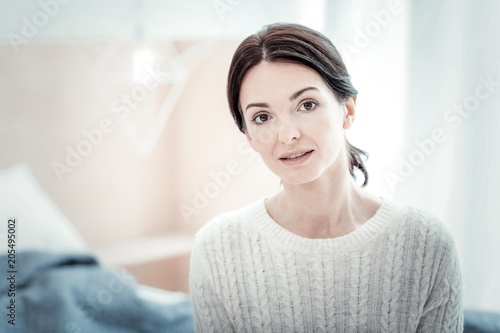 I am ready. Attractive young woman sitting on the foreground and looking straight at camera while being deep in thoughts