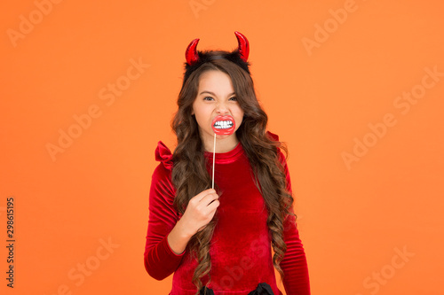 I dont bite much. Little girl wear Halloween red devil horns and mouth props. Small child dressed for Halloween party. Halloween celebration. Have beary scary Halloween