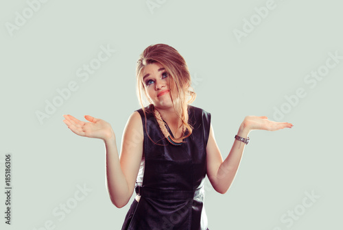 I don't know. Portrait dumb looking woman arms out shrugs shoulders who cares so what I don't know isolated on light green wall background. Negative human emotion, facial expression body language
