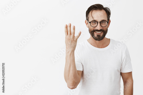 I have four kids. Portrait of good-looking charming happy male model with beard and moustache in black glasses and t-shirt, showing fourth number and smiling broadly at camera over grey wall