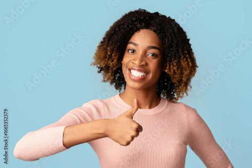 I Like It. Joyful Young African American Lady Showing Thumb Up At Camera, Black Millennial Female Gesturing Sign Of Approval, Recommending Something, Standing On Blue Background, Free Space