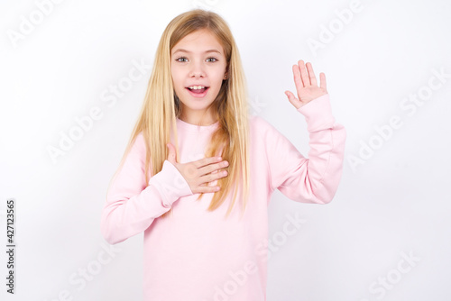 I swear, promise you not regret. Portrait of sincere beautiful caucasian little girl wearing pink hoodie over raising one arm and hold hand on heart as give oath, telling truth, want you to believe.