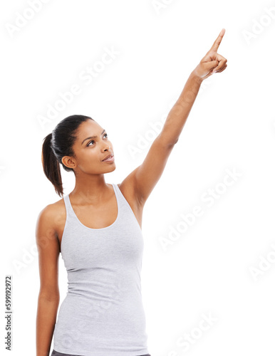 I wonder what that could be....A gorgeous young woman in gym clothes pointing upwards.