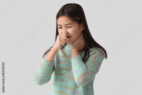 Ill Asian girl with sore throat on light background