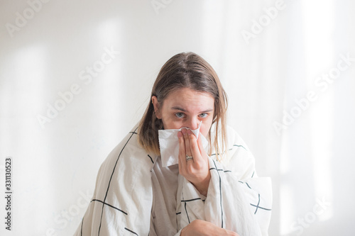 Ill woman under white blanket blowing her nose on white background. Illness treatment, home isolation, quarantine. Copy space