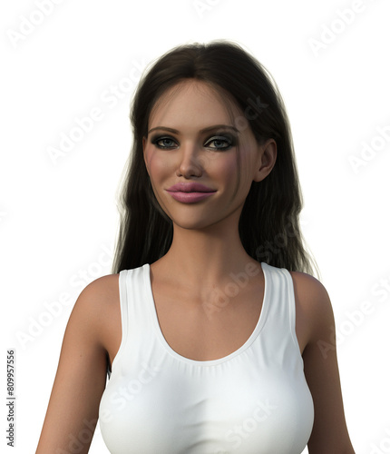 Illustration of a young woman with long dark hair with dark makeup looking forward and smiling on a white background.