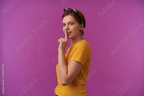 Image european brown haired charming woman 20s with natural makeup wearing stylish summer yellow t-shirt with arms over face finger touch lips emotion quite silence secret posing against purple wall