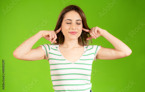 Image of a displeased young pretty blonde cute woman in casual t-shirt posing isolated over green wall background covering ears because of loud.