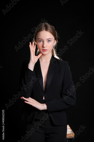 image of a model girl in a black suit on a black background