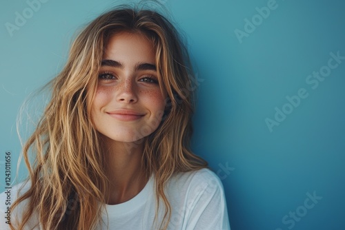 Image of a thoughtful young woman in a pink shirt, with her hands folded, gazing into the distance, set against a blue background to showcase a new cinema schedule.