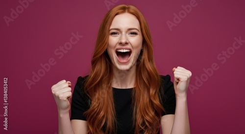 Image of a thrilled ginger woman shouting loudly with her fist raised in triumph, set against a magenta isolated background