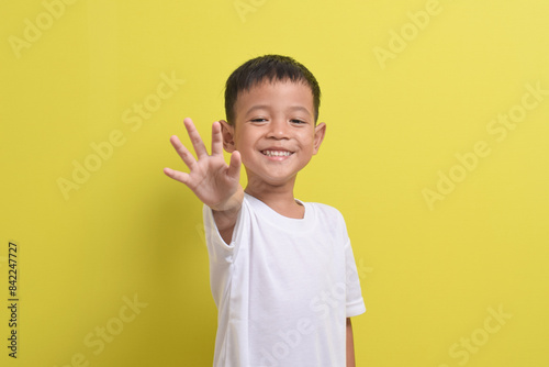 Image of Asian child posing raising his hand with five fingers, cute and smiling happily on a yellow background. portrait of an Asian boy