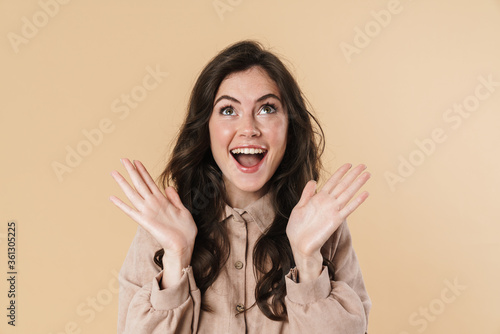 Image of delighted attractive woman expressing surprise on camera isolated over beige background