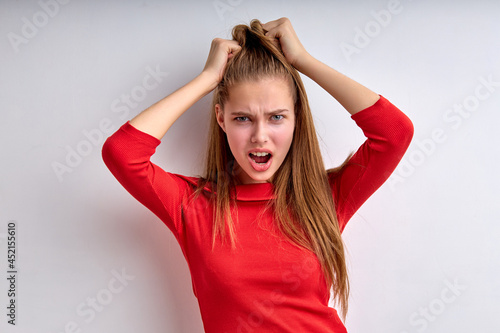 Image of disappointed shocked caucasian teen girl with long hair frowning and expressing outrage isolated over white background, female in red shirt posing at camera, screaming, what the hell
