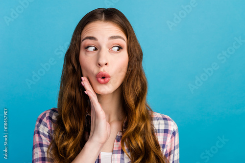 Image of excited brunette woman wearing casual shirt surprising look empty space sale isolated over blue background