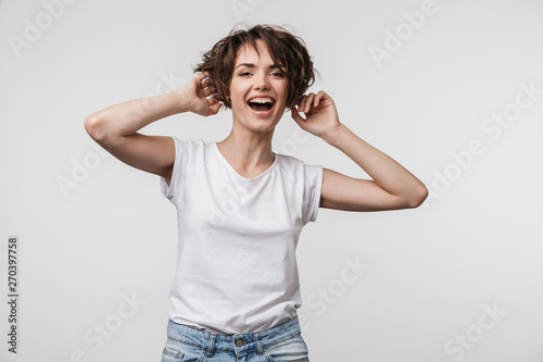 Image of happy woman in basic t-shirt touching her hair and looking at camera