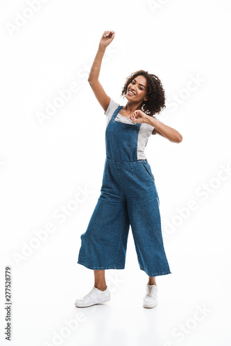 Image of joyful african american woman dressed in denim overalls smiling and dancing