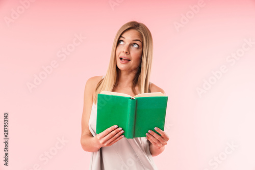 Image of joyful blond woman wearing dress smiling and looking upward while reading book