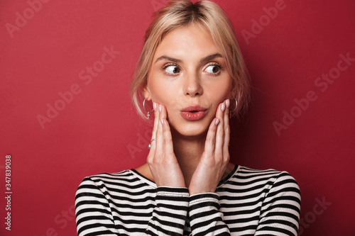 Image of nice shocked woman in striped sweatshirt expressing surprise