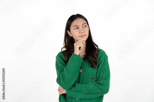 Image of thinking young lady standing isolated over white background. Looking aside.