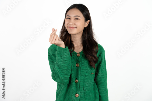Image of thinking young lady standing isolated over white background. Looking aside.
