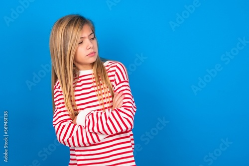 Image of upset caucasian teen girl wearing striped shirt over blue studio background with arms crossed. Looking with disappointed expression aside after listening to bad news.