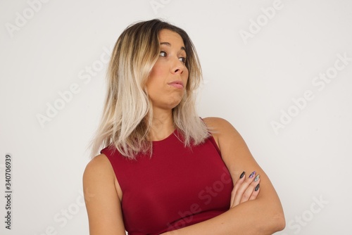 Image of upset pretty young caucasian lady standing indoors with arms crossed. Looking with disappointed expression aside after listening to bad news. Confident girl.