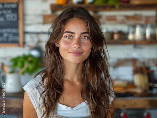 In a rustic kitchen, a beautiful young girl poses for a portrait, looking directly at the camera. Her gaze exudes confidence and charm, embodying the spirit of a small business owner passionate about