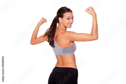 In love with sport. A young beautiful woman in gym clothes flexing her arms against white isolated background.