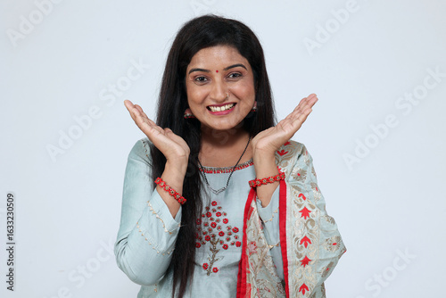 Indian happy woman showing wow expressions looking at camera in excitement offers. Expressive facial expressions Beautiful woman act like a satisfied excited product Isolated on studio