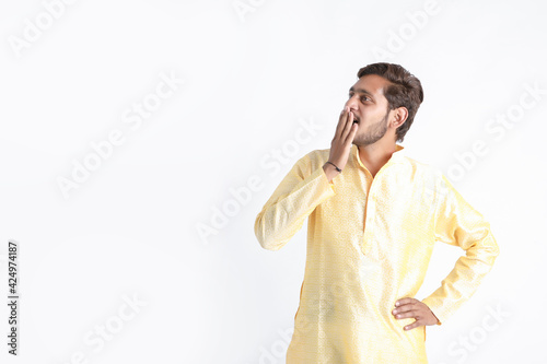 Indian man in tradition wear and showing excited expression on white background.