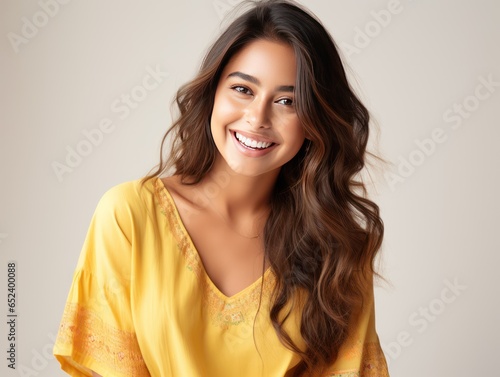 Indian model smiles confidently during a summer clothing photoshoot adding vibrancy to the collection