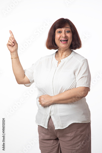 Indian senior woman showing to copy space empty blank text space. Smiling elderly female looking at camera pointing Studio portrait isolated on white background