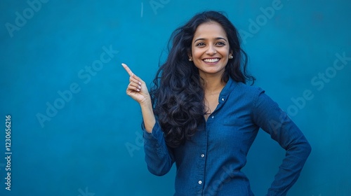 Indian woman in blue jeans and shirt smiles at the camera and points to the side. She is happy and confident.