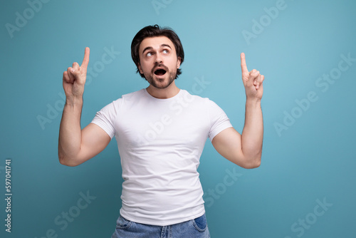 indignant stylish brutal brunette man in a white t-shirt points his finger to the side