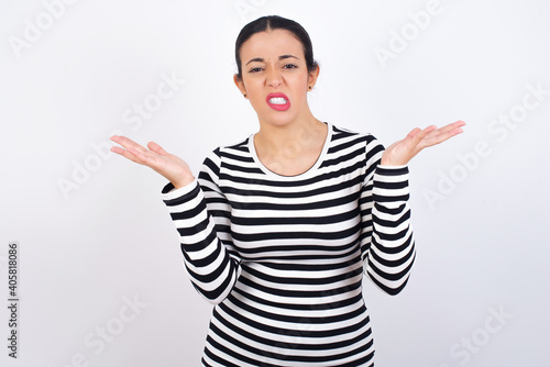 Indignant Young beautiful woman wearing stripped t-shirt against white background gestures in bewilderment, frowns face with dissatisfaction.