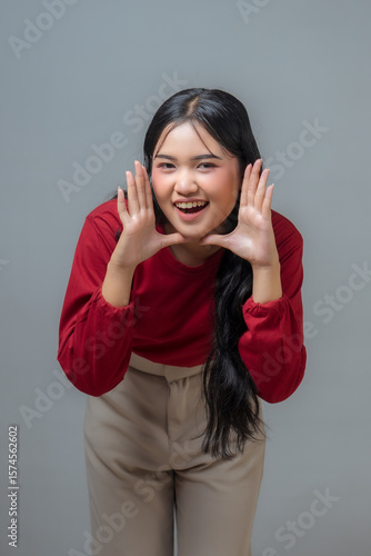 Indonesian woman smiling and gesturing with her hands around her mouth as if announcing something. She wears a red long-sleeve shirt and beige pants, radiating joy and energy.