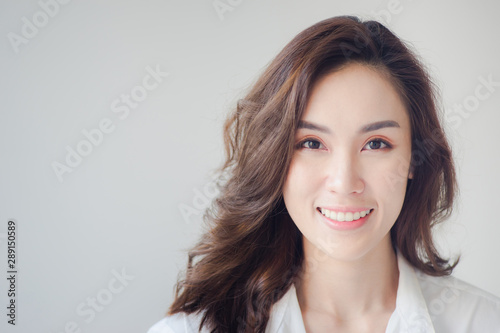 Indoor portrait of beautiful brunette young woman with smiling cheerfully, showing her white teeth to camera with copy space