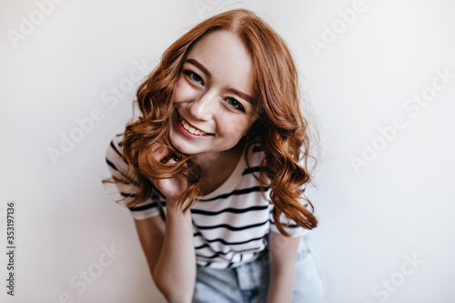 Indoor portrait of emotional ginger girl laughing to camera. Studio photo of excited caucasian lady wears striped shirt.