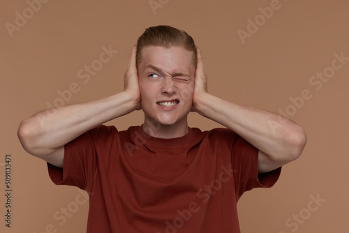 Indoor portrait of young blonde man posing over beige background close his ears with palms