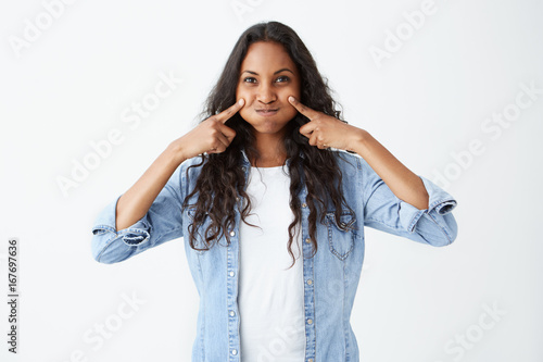 Indoor shot of Afro-american pretty brunette woman making grimace blowing her cheeks having pleased expression. Beautiful young woman with dark skin dressed in casual clothes mocking.