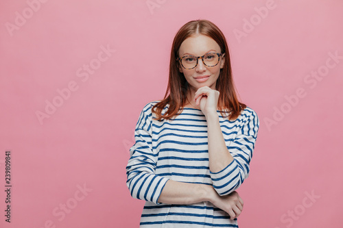 Indoor shot of attractive dark haired woman keeps hands under chin, wears striped sailor sweater, optical eyewear, models over pink background, looks directly at camera, has confident expression
