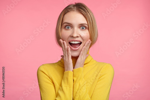 Indoor shot of beautiful amazed female student looks delightfully into camera, rejoices successfully passed exam or wining first place on competition, achieves aims, shows great result, good knowledge
