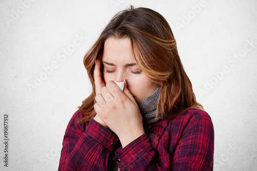 Indoor shot of female with fever and headache, uses tissue and sneezes all time, has running nose and migraine, caught seasonal virus, isolated over white background. Cold or flu symptoms