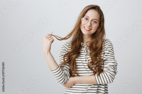 Indoor shot of friendly cute caucasian girl in transparent glasses playing with hair strand while smiling broadly over gray background, talking and spending leisure in cafe with friends