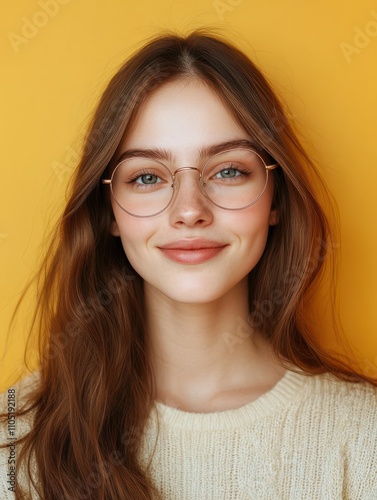 Indoor shot of good looking young Caucasian woman has broad smile, being in good mood after date with boyfriend, wears round glasses, looks directly at camera, poses against yellow studio wall.