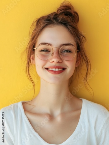 Indoor shot of good looking young Caucasian woman has broad smile, being in good mood after date with boyfriend, wears round glasses, looks directly at camera, poses against yellow studio wall.